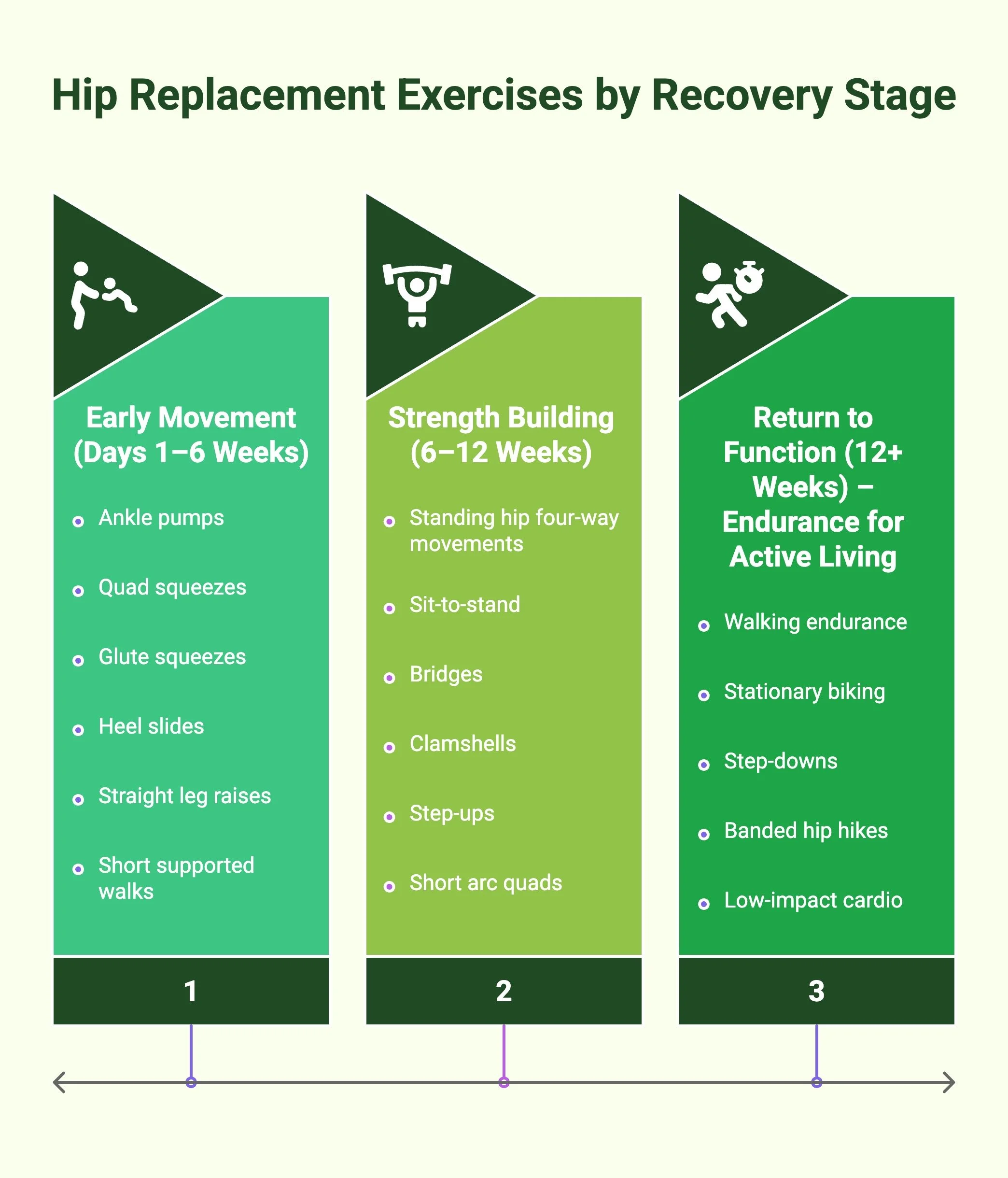 Recovery after hip replacement requires careful progress, with attention to pain levels, swelling, and safe movement as activity gradually increases.